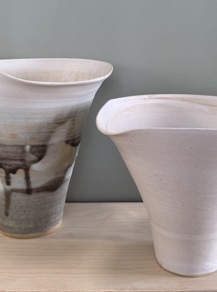 The wheel-throwing process add a layer of material literacy to Tachelet’s work. Centring clay and shaping out forms are actions that require precise coordination between the hands, the eyes and the rotating clay. Tachelet’s choice to work in both stoneware and porcelain demonstrates a thorough understanding of both materials—stoneware being robust and forgiving, while porcelain tending to be more challenging yet capable of creating delicate paper-thin walls. Her work is witness of her fascination with the movement of materials, both on the wheel and through the glazing and firing process, whereby surface and form become her canvas in space.